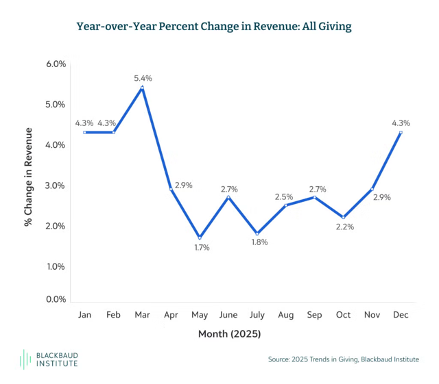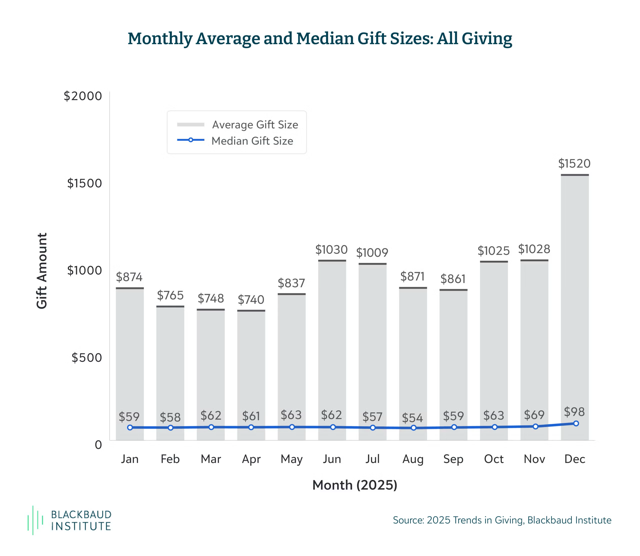 While overall giving grew by roughly 4.3%, online giving grew by a massive 11% YoY, peaking in November. The median online gift size hit $364 in December.